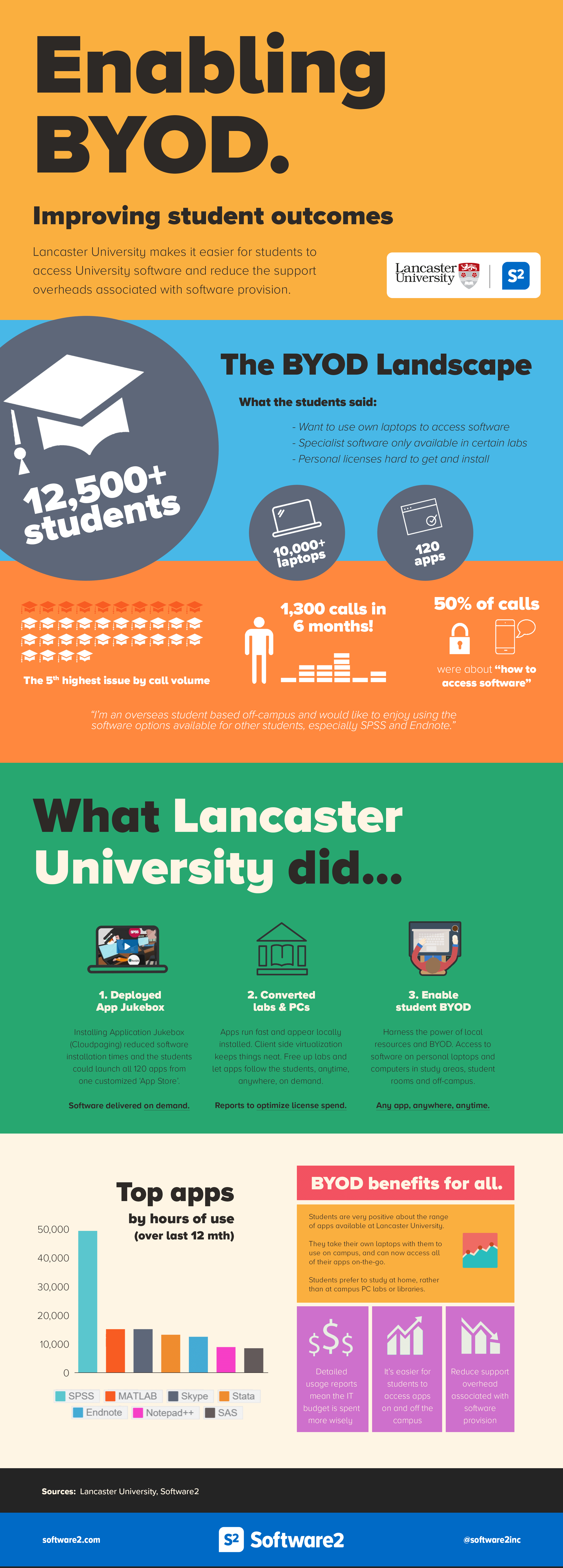 The infographic below shows how Lancaster University are using AppsAnywhere to make their apps available to any student (or staff member), anywhere, on any device, and on demand, for true university BYOD.